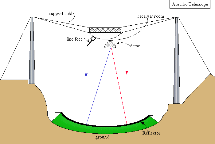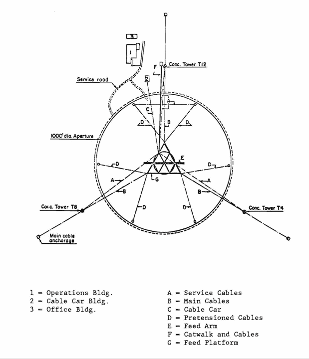 | 0.1 (F)   Here is a schematic diagram of the AO telescope as viewed from above. The 900 ton platform hangs in midair on eighteen cables, which are strung from three reinforced concrete towers. One is 365 feet high, and the other two are 265 feet high. The towers are named as if they were on the face of a clock oriented with "12" to the north: T4, T8 and T12. Which tower is the tallest of the 3? Note: this map predates the ground screen/upgrade. |