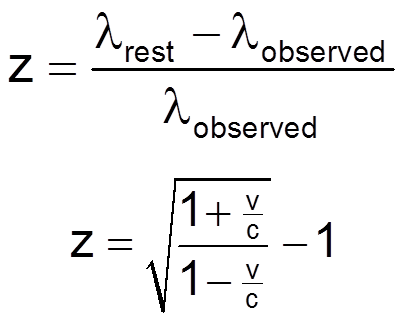 | In extragalactic astronomy, we normally use "z" to indicate the observed redshift (or blue shift). Because distant galaxies are moving away from us at velocities that are a significant fraction of the speed of light, we need to adopt the relativistic doppler formula to relate z to a recessional velocity. This relation defaults to the simple doppler formula for v << c. See the equations to the right.     g.   At what frequency would be observe the HI in a galaxy at a distance of 70 Mpc from us?   Hint: What is "Hubble's Law"?     h.   Over what frequency range would be expect to see HI line emission from the Milky Way? |
