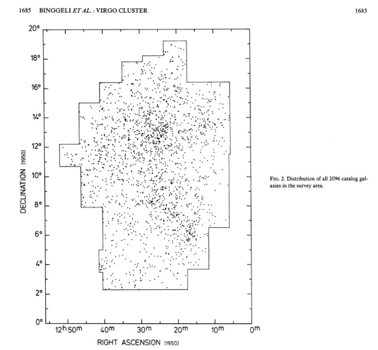 An important compilation of galaxies in the Virgo cluster was presented by Binggeli, Sandage and Tammann 1985, Astron. J. 90, 1681. Their Virgo Cluster Catalog (VCC) consists of 2096 galaxies which they believed, based on examination of high quality photographic plates, are likely cluster members. Note that their investigation of the cluster was based on many fewer redshifts than are available today. To the right is the sky distribution of possible cluster members as appeared in their paper.
