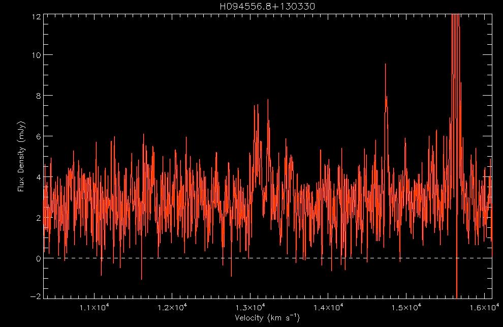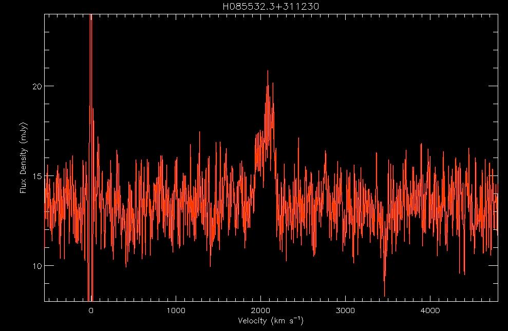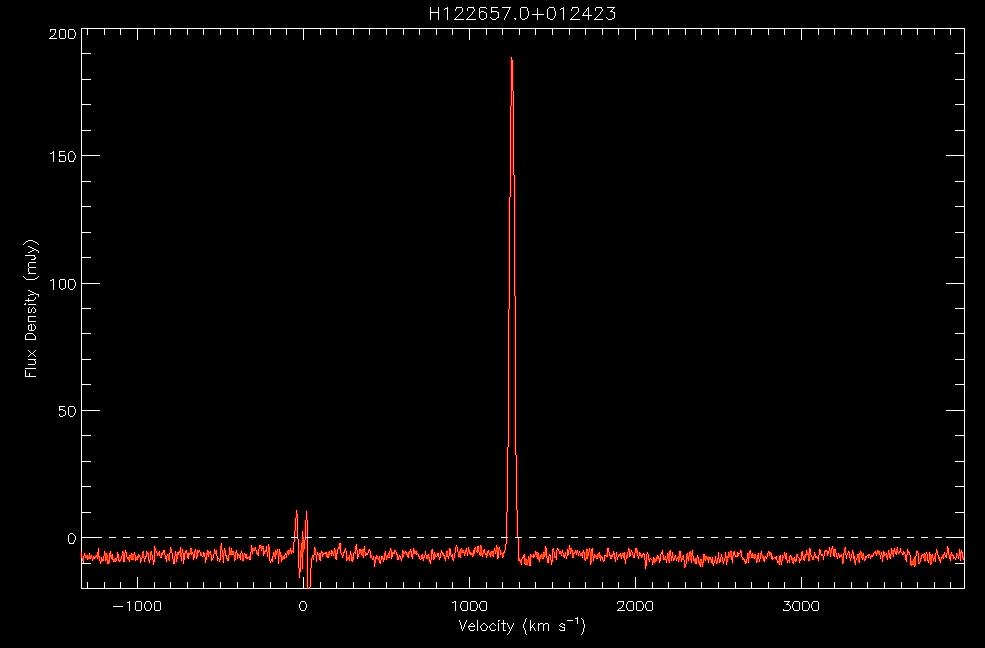 Let's try to figure out what these spectra show.     a.   Identify each of the features A, B, C and D in the spectra shown in velocity units. Click here to see a larger version of the first WAPP spectrum, centered at 1415 MHz.     b.   How can you explain Feature A?     c.   What is feature B associated with and why does it appear to be show both positive and negative flux density? Click here to see a larger version of the third WAPP spectrum, centered at 1375 MHz.     d.   Feature D arises from well-known radio frequency interference (RFI). Check out Phil Perillat's list of RFI frequently seen at Arecibo and our own ALFALFA team RFI page. What is Feature D?     e.   Why isn't the transmitter responsible for the RFI at 1381 MHz on all the time? Hint: See our ALFALFA team RFI page. |