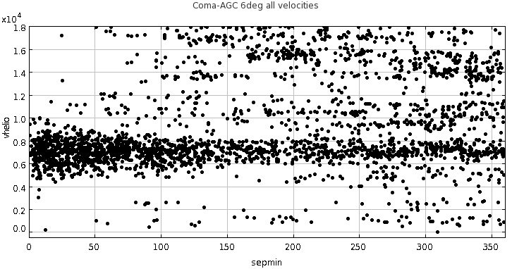 Now, let's examine the very large scale structure in the general surrounding of MKW 11. A convenient way to examine large scale structure is to make a "cone diagram" of an almost-2-D "slice". For this purpose, there are two more files containing galaxies in a 5 degree wide "slice" of the universe: R.A:. (7.5 to 16.5 hours), Dec: (10.5 to 15.5 deg), Vhelio: (0, 18000 km/s). In this case, we are converting RA,Dec and heliocentric velocity to "radial coordinates" radx and rady, centered on the 12 hours RA (radx=0.). As before, there are two files: In this region, there are three rich clusters of galaxies worthy of note: