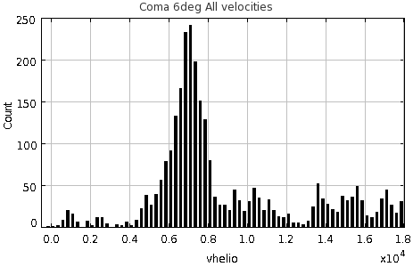 To the right is a similar histogram made for the Coma cluster. It contains all galaxies within 6 degrees of the center of the cluster which have measured heliocentric radial velocities.