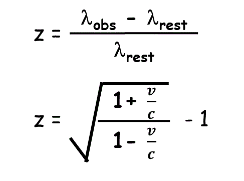 | In extragalactic astronomy, we normally use "z" to indicate the observed redshift (or blue shift). Because distant galaxies are moving away from us at velocities that are a significant fraction of the speed of light, we need to adopt the relativistic doppler formula to relate z to a recessional velocity. This relation defaults to the simple doppler formula for v << c. See the equations to the right.     g.   At what frequency would be observe the HI in a galaxy at a distance of 70 Mpc from us?   Hint: What is "Hubble's Law"?     h.   Over what frequency range would be expect to see HI line emission from the Milky Way? |