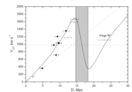 We know that locally, the expansion of the universe is "perturbed" by the fact that galaxies tend to cluster. As depicted in the cartoon to the right, taken from a publication in the 1980's, it has been known for some time that the Local Group is falling towards the Virgo Cluster, even as the local universe expands.